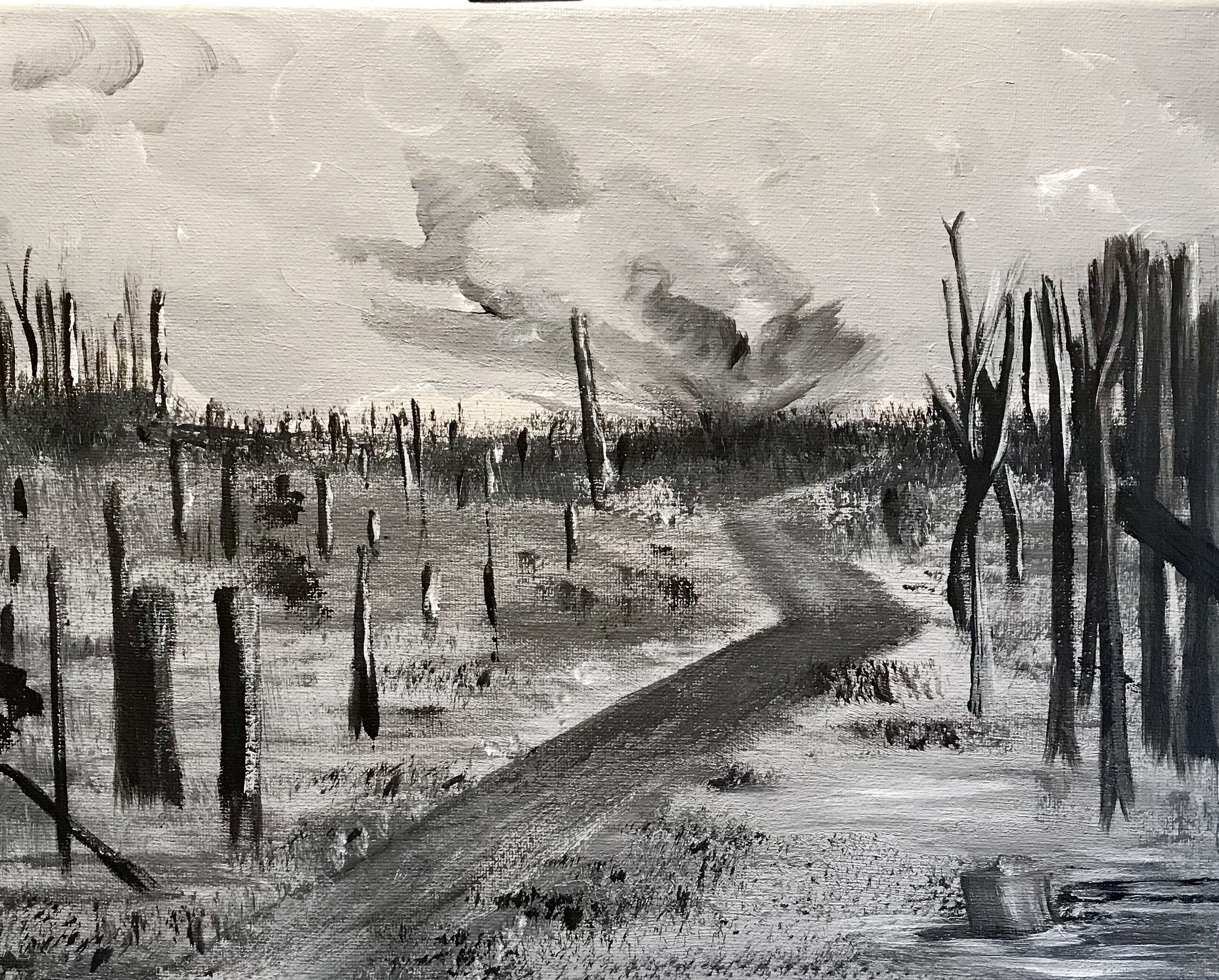 Your description, coupled with the painting, conjures up a landscape that looks more like a moonscape of shell holes with either fog or gas on the horizon, There’s only one thing missing. Bodies of the dead. Or a burnt out tank. Something to symbolize humans were there.