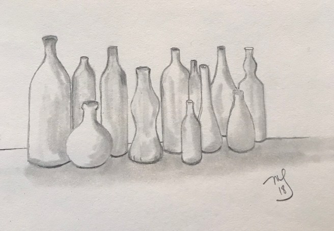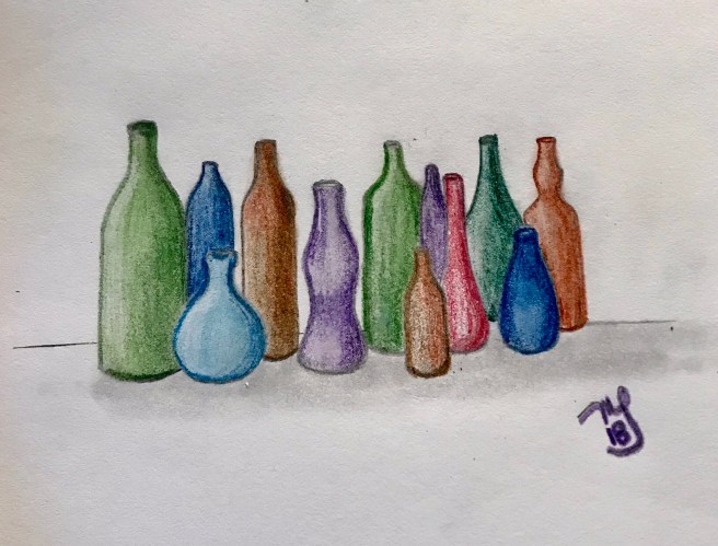 I am not a collector, unless you count books, and I’ve already done a sketch of a stack of books. After that, the first thing that came to mind was bottles. I’ve never had a bottle collection, unless you count my liquor cabinet, but I thought they would be fun to draw and good practice in shading. And after I finished the initial drawing, I decided to see how it would look in color. Here are my collections:
