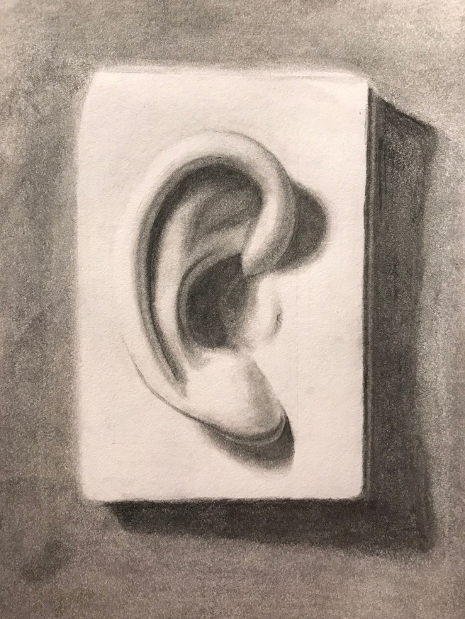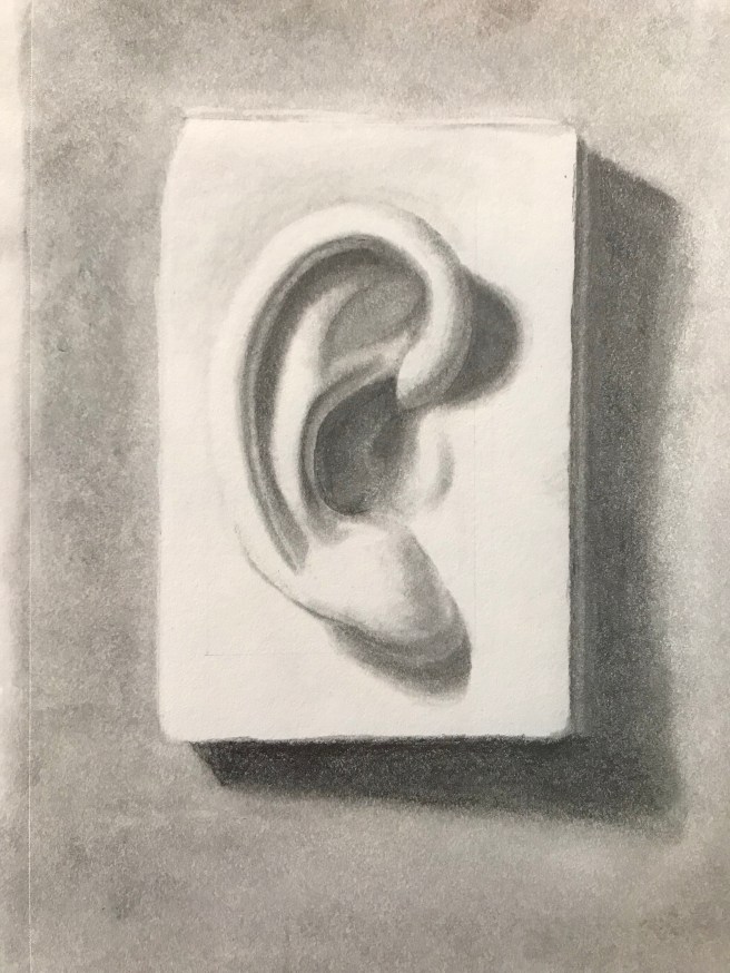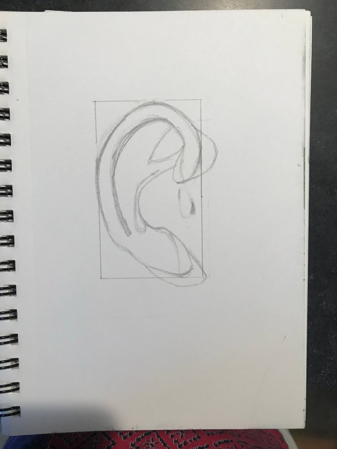 This is another drawing tutorial – this time a cast of an ear, one of the most difficult body parts to get right. I begin with measurements, including a box in which the ear will fit. I’ll let the progression show you what I did, beginning with my reference photo: