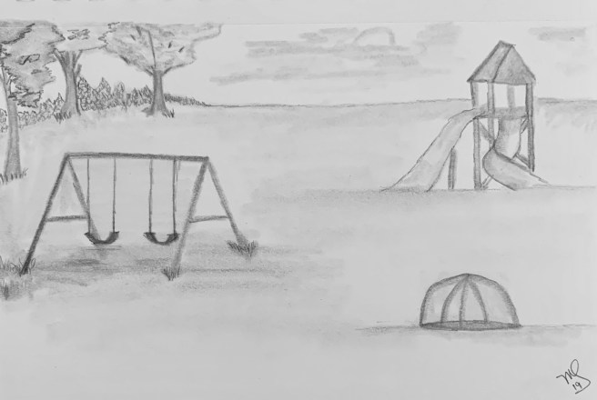 This time around the theme was “playground”. When I was coming up with these themes, this one sounded like fun. Ah, but not so in practice. Just when I got my art supplies back, too. However, for a quick sketch, I think it’s ok. Let’s call it a cartoon and be happy with that!