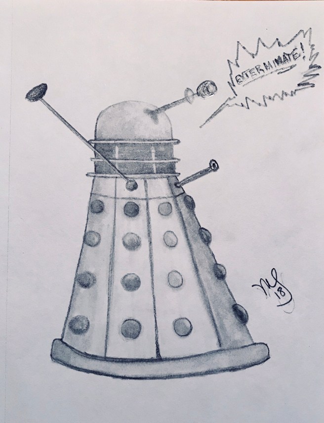 As a big science fiction fan, I could have chosen any number of favorite robots (or androids) but I chose to draw a Dalek from Doctor Who. When I was a kid, I watched Tom Baker’s Doctor face off against these evil creatures – a living being controls the mechanical body – and was absolutely terrified by them. For those of you unfamiliar with Doctor Who, I realize how silly that must seem. What’s so scary about a canister vacuum with a couple of plungers attached, right? Despite their rather ridiculous appearance, only the Daleks threaten the very existence of the universe! Here is my mine: