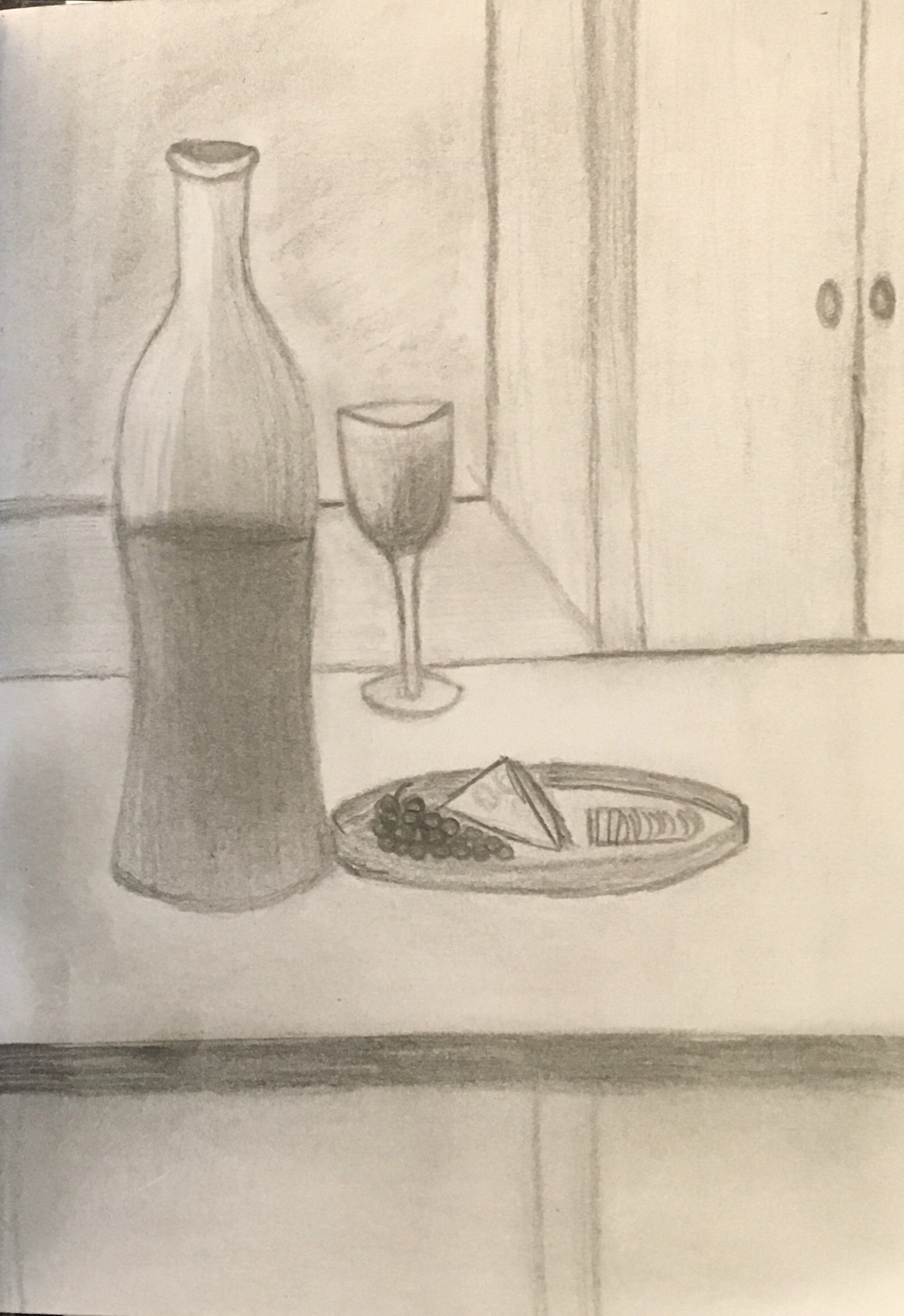It was time to paint the kitchen. I changed the color from a sage green to a cheerful blue. It kind of looks ‘beachy’ now. With that in mind, some of the artwork no longer looks good against the color. I have a small blank space that I want to try and fill with a piece of my own art. So what goes well in the kitchen? A still life. Let’s see if I can pull off painting something like this preliminary sketch. Or maybe that’s too cliche…. Hmmm.