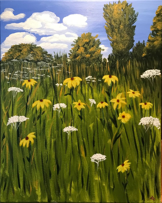 No fiction today, I need time to compose my thoughts. Instead, here is one of my most recent paintings. This scene is one I pass on my daily walk. In mid to late summer, the meadow blooms with Queen Anne’s Lace and Black-eyed Susans: