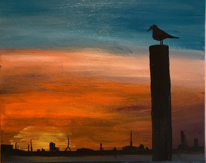 One cool thing about teaching yourself to paint with acrylics is that you can reuse already painted on canvases. That means each time you try something that doesn’t turn out so good, the canvas is not wasted. Trust me, you will waste a lot of canvases in the beginning. A few weeks back, my talented photographer friend, Son of a Beach posted a photo of a lone gull in the sunset and I just knew I wanted to try to paint it. I had just the thing… one of my very first attempts was full of all the colors I would be using for the new painting so no worries about bleeding through. Here’s the result: