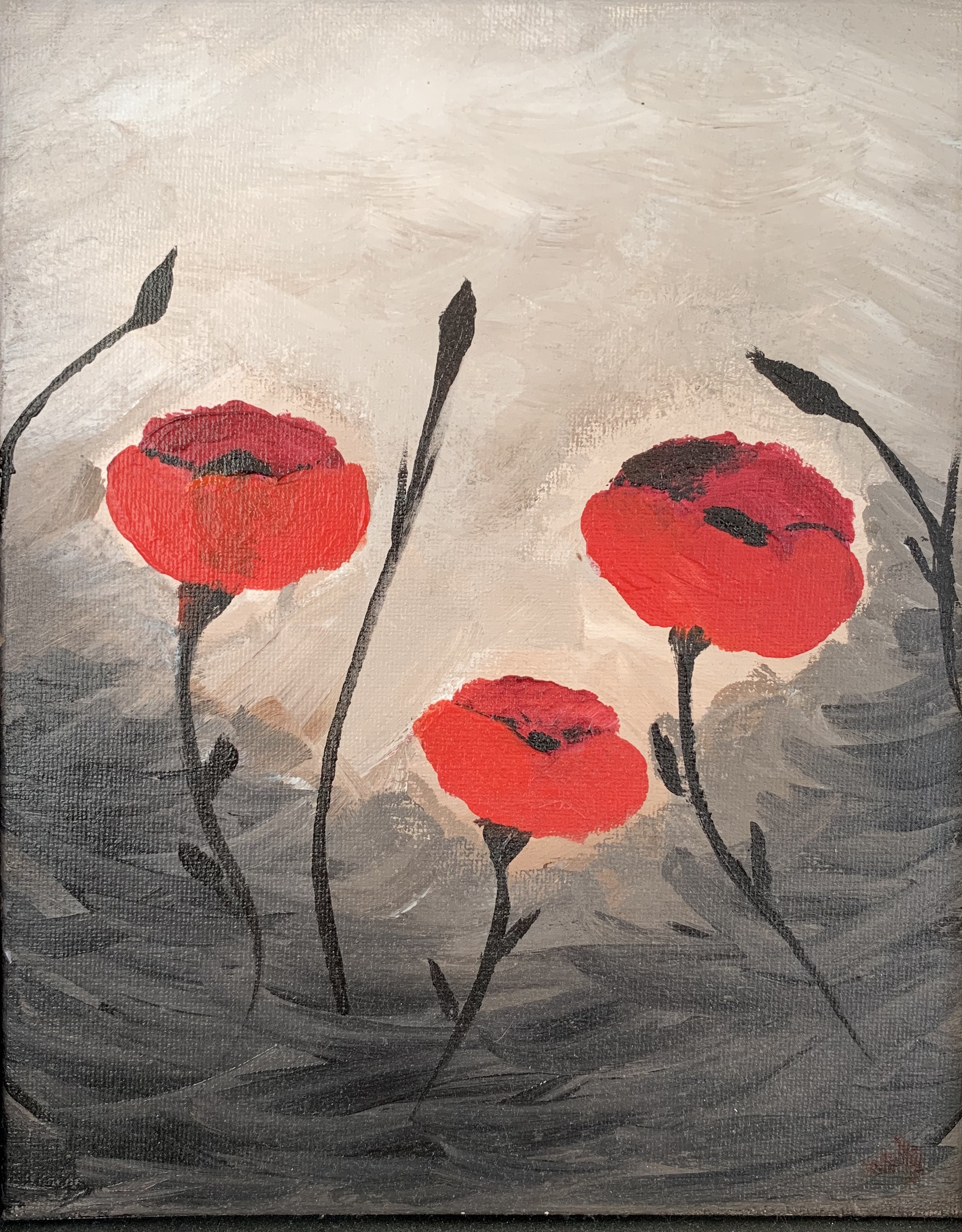 Poppies have become a favorite subject to paint. I’d love to plant them in my garden [if I’m ever able to get out to a garden center this year] but in the meantime, I can at least adorn my walls with them. It’s said the poppies grew more abundantly on the soil where the soldiers fell on the Western Front during the Great War. So while they are a symbol of remembrance, they also remind us of how the earth heals itself. From the ravished earth springs forth new life. We see how nature is taking a deep breath while we have lowered our impact on it. The air is fresher, the waterways are cleaner and the birds seem to be singing more loudly. A bright spot, if you will, during this dark time. Here are my Bright Poppies in a Dark Field: